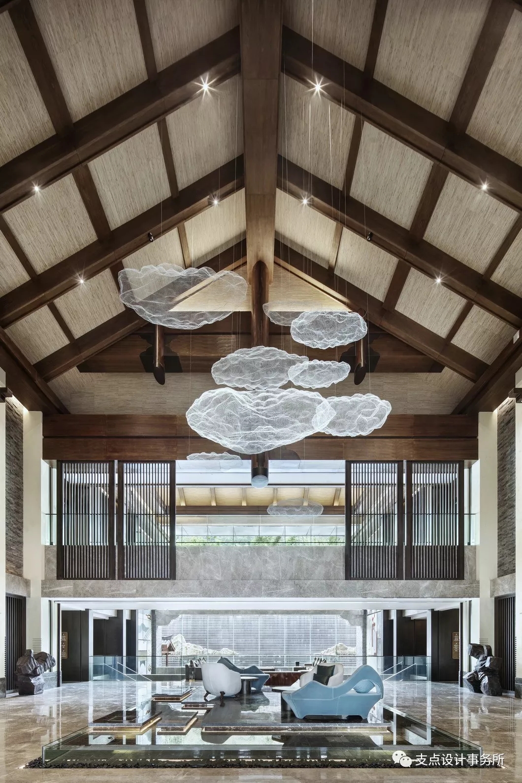 下沉式戲水臺大堂吧位于酒店負一層,挑高的空間,縱深感的木質(zhì)線條,樸實的青磚,水墨痕的理石,仿佛透過時間的薄霧去感受另一個時空的東方意韻。