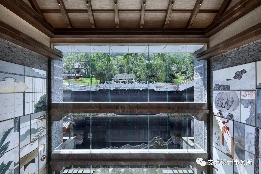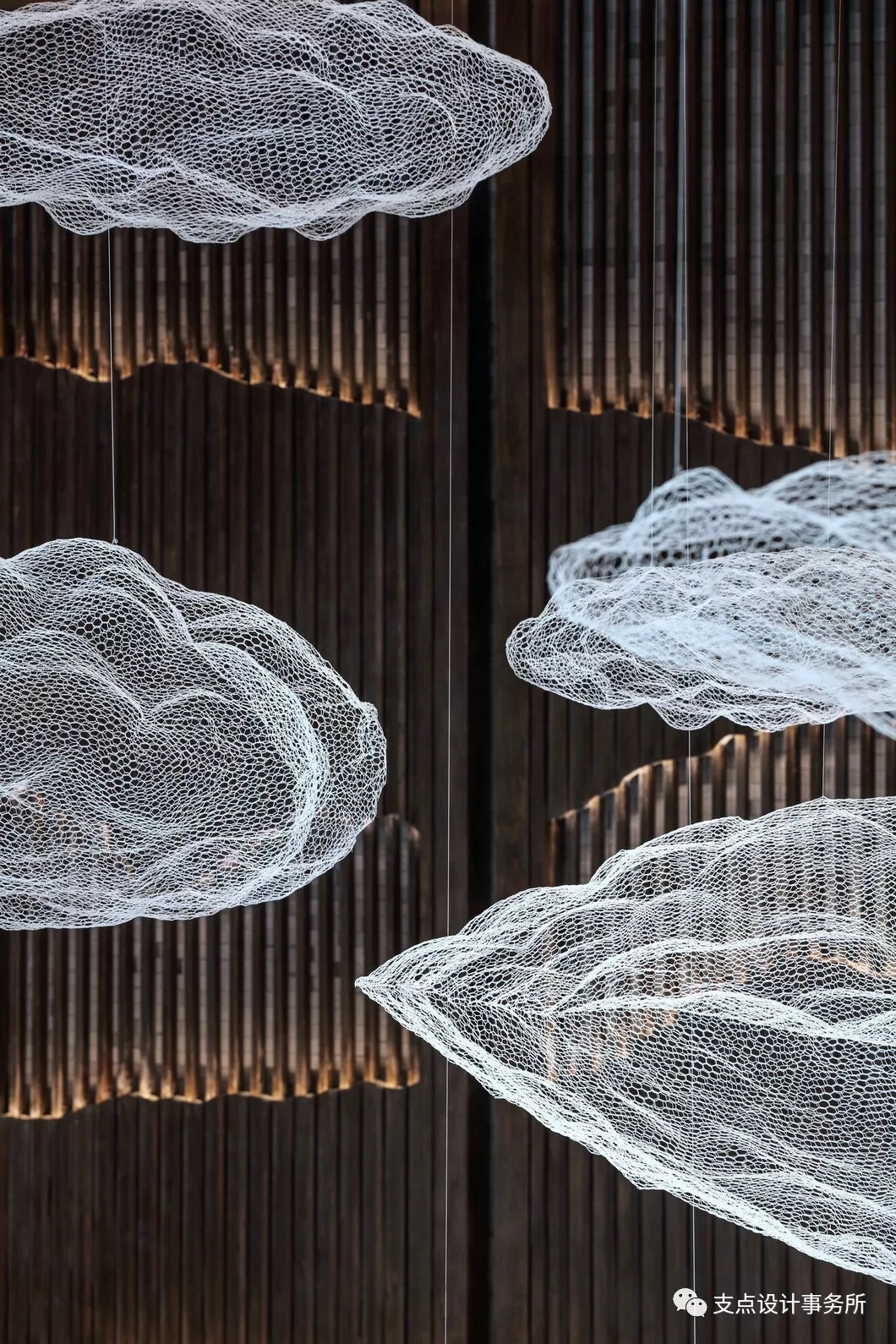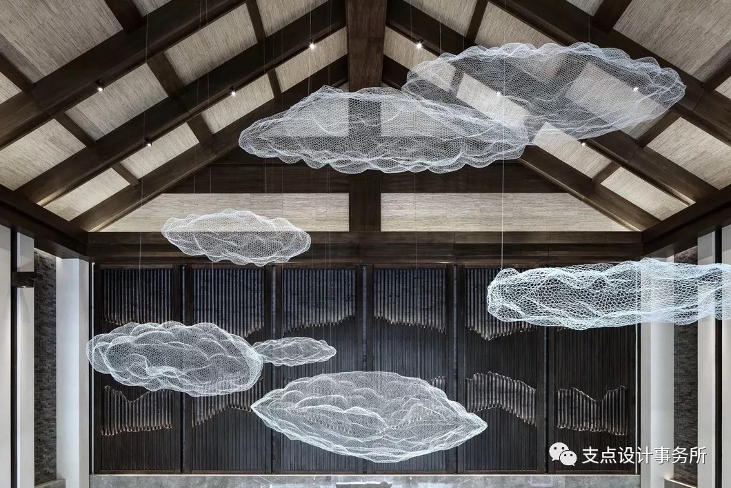 延續(xù)建筑的坡屋頂,運用木梁,取其結(jié)構(gòu)之美,仿若存在于空間的時光刻度,空間中融入了時間因素,完成了四維的存在?;蛑靡惶幐呱搅魉⒒蚍乱惶幵旗F繚繞,或綠植掩映,或山石悠悠,移情于景,凝神于形,寓意于象。
