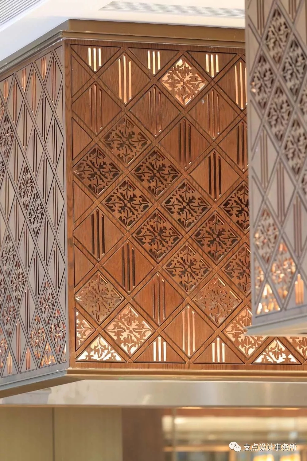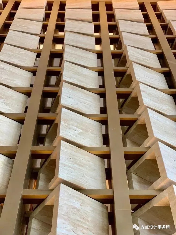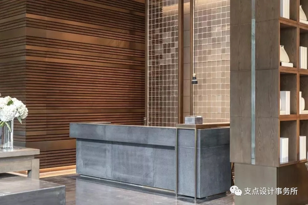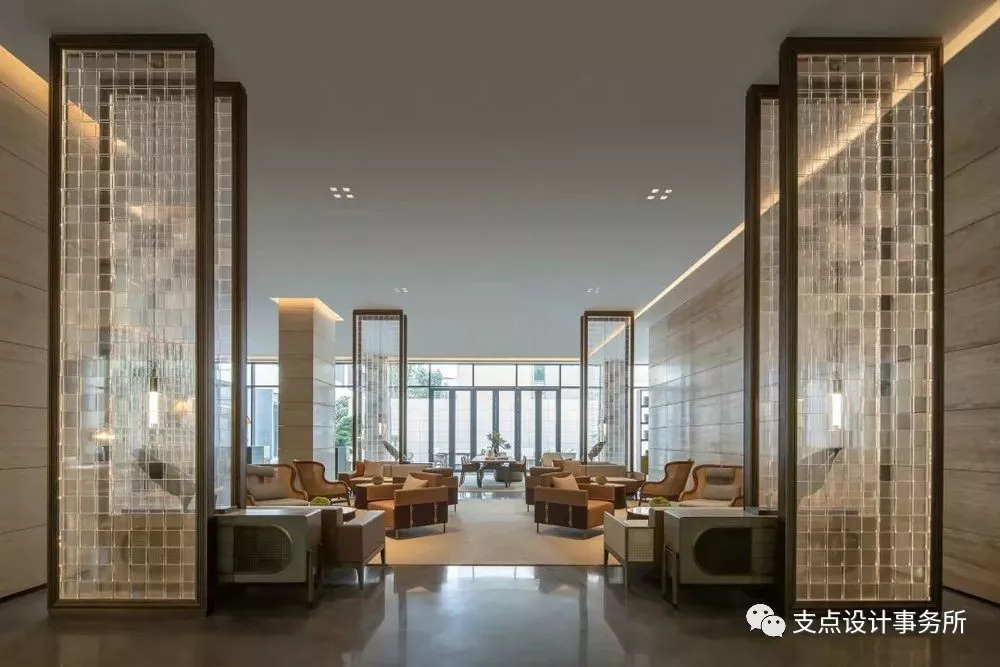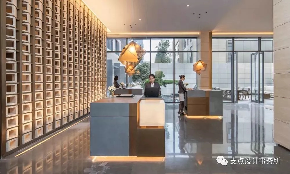 設計師選用大宅的手法來設計酒店大堂,賓客從落客區(qū)下車進入酒店,第一視覺并不是大堂,而是一扇數(shù)米寬的大門,仿佛進入大宅一般。進門后看到片墻,文化展示區(qū),一些景觀,然后才來到大堂吧、接待臺。通過巧妙的設計手法表達“海上浮城”的設計概念。