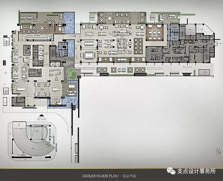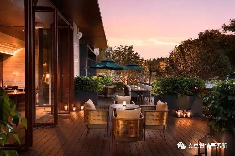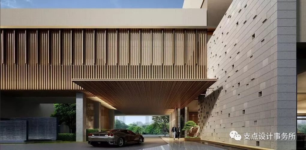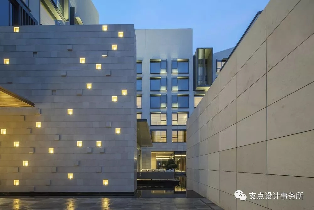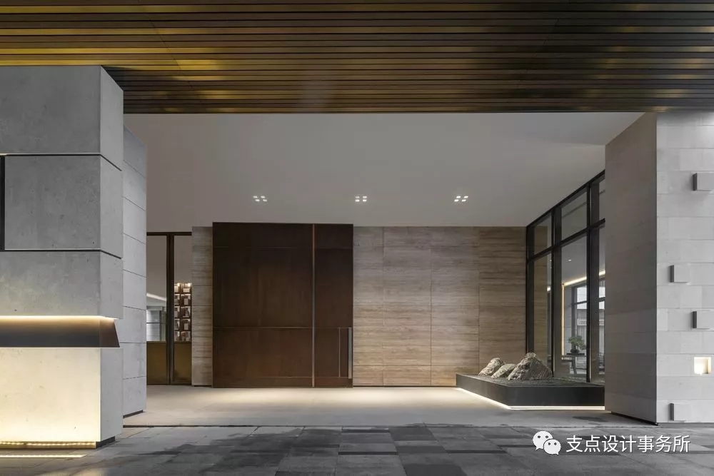 設計師選用大宅的手法來設計酒店大堂,賓客從落客區(qū)下車進入酒店,第一視覺并不是大堂,而是一扇數(shù)米寬的大門,仿佛進入大宅一般。進門后看到片墻,文化展示區(qū),一些景觀,然后才來到大堂吧、接待臺。通過巧妙的設計手法表達“海上浮城”的設計概念。