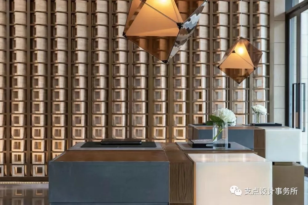由方塊盒子構成的立面,從下往上由虛到實的變化,帶給人一種水上漂浮的感覺,而有序的角度漸變又有一種隨水流擺動的韻律感;接待臺的一角漂浮到空中,成為泛著暖光的吊燈,漂浮在海上,整個酒店就像一個海上浮城。相對于酒店來說,空間中的每一個盒子都是酒店這個浮城的構成。每個方塊底下通過干凈的燈帶來制造凌空懸浮的感覺。