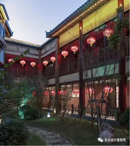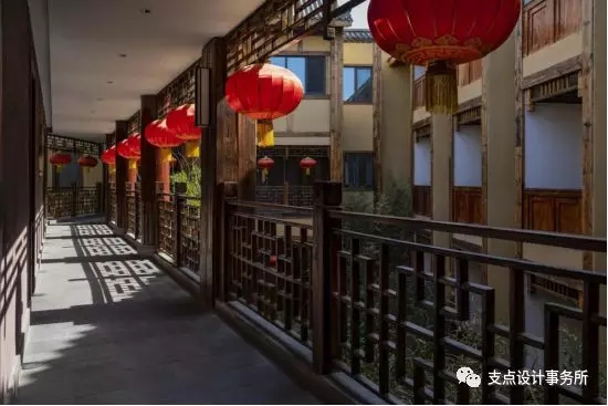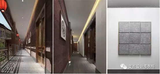 走廊原木立柱呈現(xiàn)強(qiáng)烈的韻律感,覆盆柱礎(chǔ)仿佛從地面生長出來,且采用與地面同一色澤。柱面也并非光滑細(xì)膩,甚至能隱約看出原木的紋路。紅褐色夯土墻與白色墻泥塑造的粗糙肌理,在低照度的光源等一系列細(xì)部處理手法,透出原始的樸拙感。山水畫、磚雕主題與燈籠等傳統(tǒng)細(xì)節(jié)的飾品點(diǎn)綴貫穿于整個走廊,賓客在其間穿行、停留,擁有豐富而不同的感官體驗,卻歸于統(tǒng)一而寧靜的心靈感受,最終放松而滿足于此次的身心之旅,并盼望重新歸來。