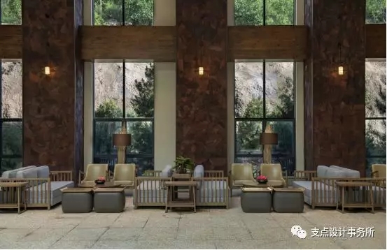 接待中心包含接待大廳、男賓區(qū)、女賓區(qū)、全日制餐廳、健身房、茶吧、影音廳、泳池、VIP包房等空間。由支點空間設(shè)計事務所設(shè)計總監(jiān)主持設(shè)計,利用自然的材料、質(zhì)樸的線條將室內(nèi)外有機結(jié)合,將接待中心融于山水之間,沉浸在清靜空靈的景致之中。居于山,隱于林,憩于水,在純粹原生態(tài)的天性世界中,凈肺、凈心、凈情。