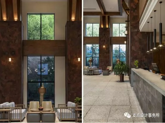 接待大廳是一座兩層挑高中空結(jié)構(gòu),設(shè)計運用原始自然材料與對稱的設(shè)計,將崇尚自然的姿態(tài)躍然其中。貫通到頂?shù)牧⒅貌灰?guī)則火山巖拼貼,承托著頂部原木木梁架結(jié)構(gòu),墻面雜木板與夯土墻泥的裝飾將接待大廳還原為一種謙遜的背景,回歸自然,頂部方形玻璃采光頂將自然天光引入到室內(nèi),穿過橫梁的結(jié)構(gòu)浸漫在大廳中央,給空間注入生機,人們會不自覺的感受到空間隨著光線移動而產(chǎn)生的微妙變化。創(chuàng)造一個與自然環(huán)境和諧共生的一方空間。