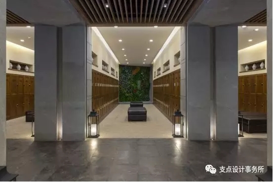 男賓部女賓部分層設(shè)置,在平面布局上,不僅是遵循東方文化中對「回」與「聚」的愿想,也為步入度假村的客人屏去喧囂。以走廊為中軸線,更衣區(qū)呈對稱的形式分布兩側(cè),通道兩側(cè)燭臺燈,為空間增強了儀式感。